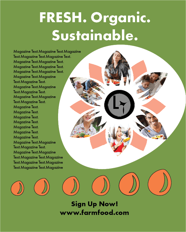 This is a magazine ad for a fictitious meal service. The meal service is aimed at Millenial and Gen X parents. The white represents the innocence of children, and the green displays the nutritious growth that comes from organic foods.